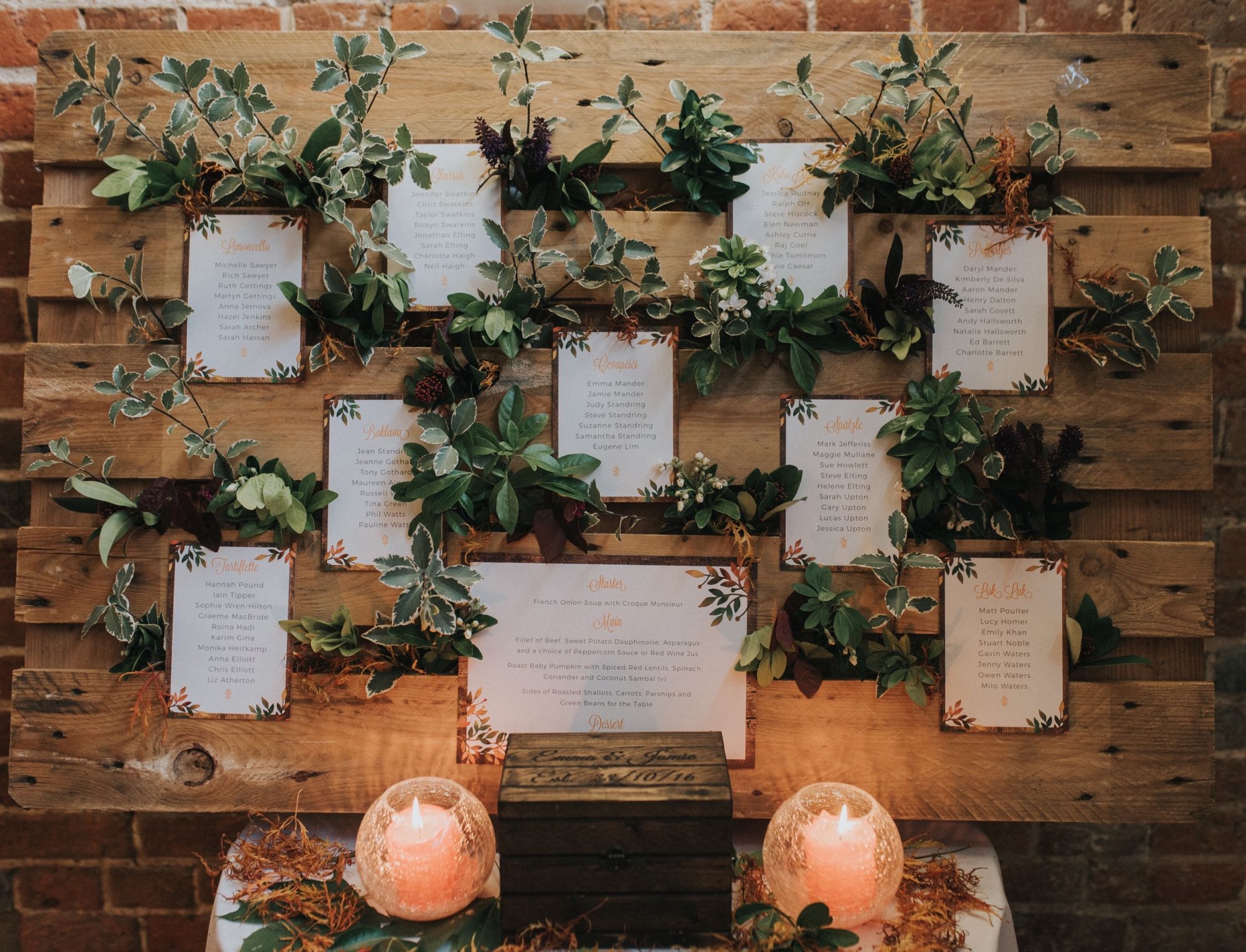 An easy way to make a huge impact is to decorate your table plan with foliage and florals, and in our view there’s no such thing as too much. Layers of fresh bright greens or dried grasses can create a whimsical feel or provide high drama. Add in some bursts of colour with florals for greater impact or to work with your chosen colour palette.