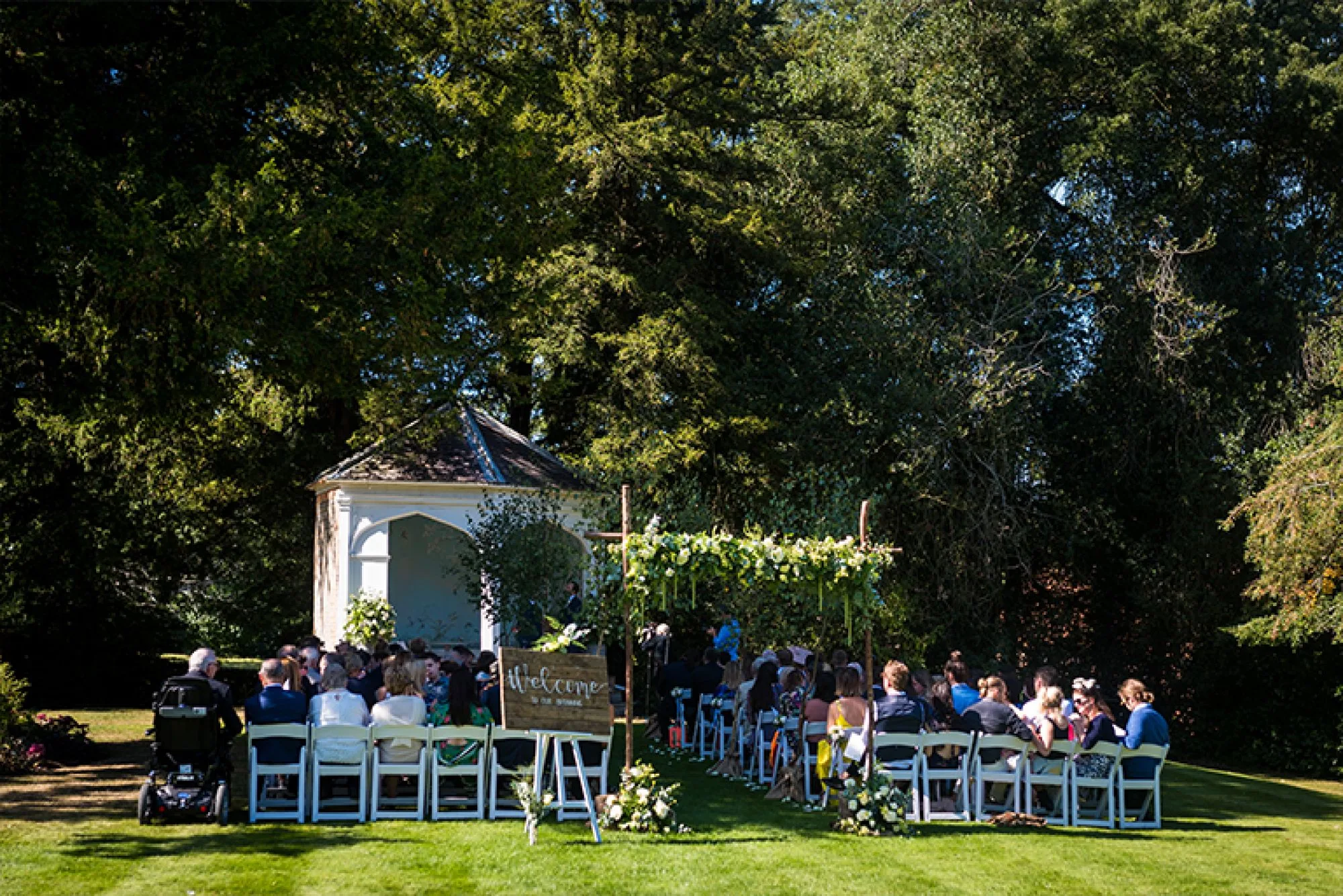 Embracing organic, natural materials and textures, birch trees were used to line the aisle for the outdoor ceremony in the Victorian Summerhouse while roses, herbs and eucalyptus adorned the chairs beside the aisle.
