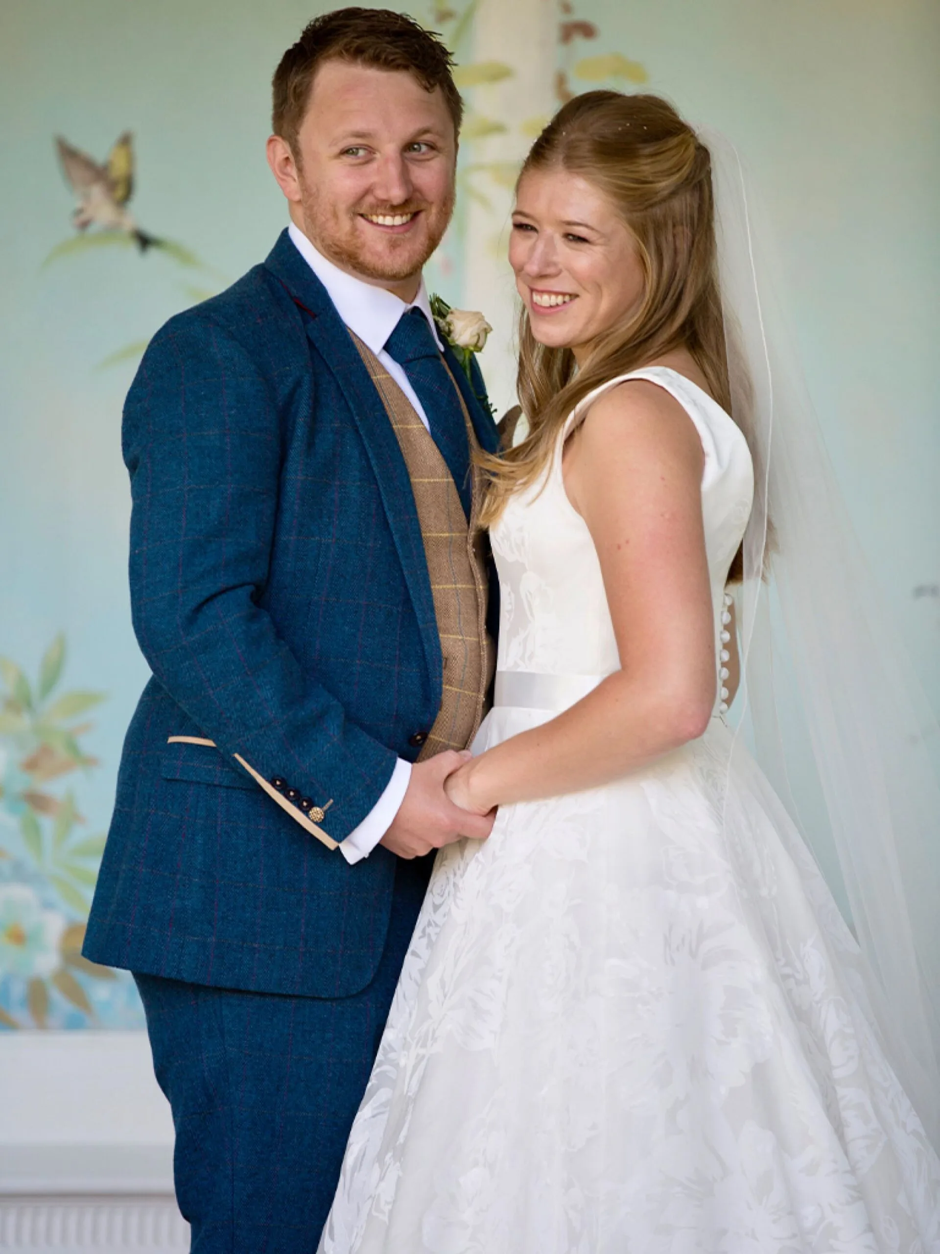 Brent looked the part in a soft lapis blue tweed checked suit by Marc Darcy which he wore with an oak tweed herringbone waistcoat, tie and brown brogues.