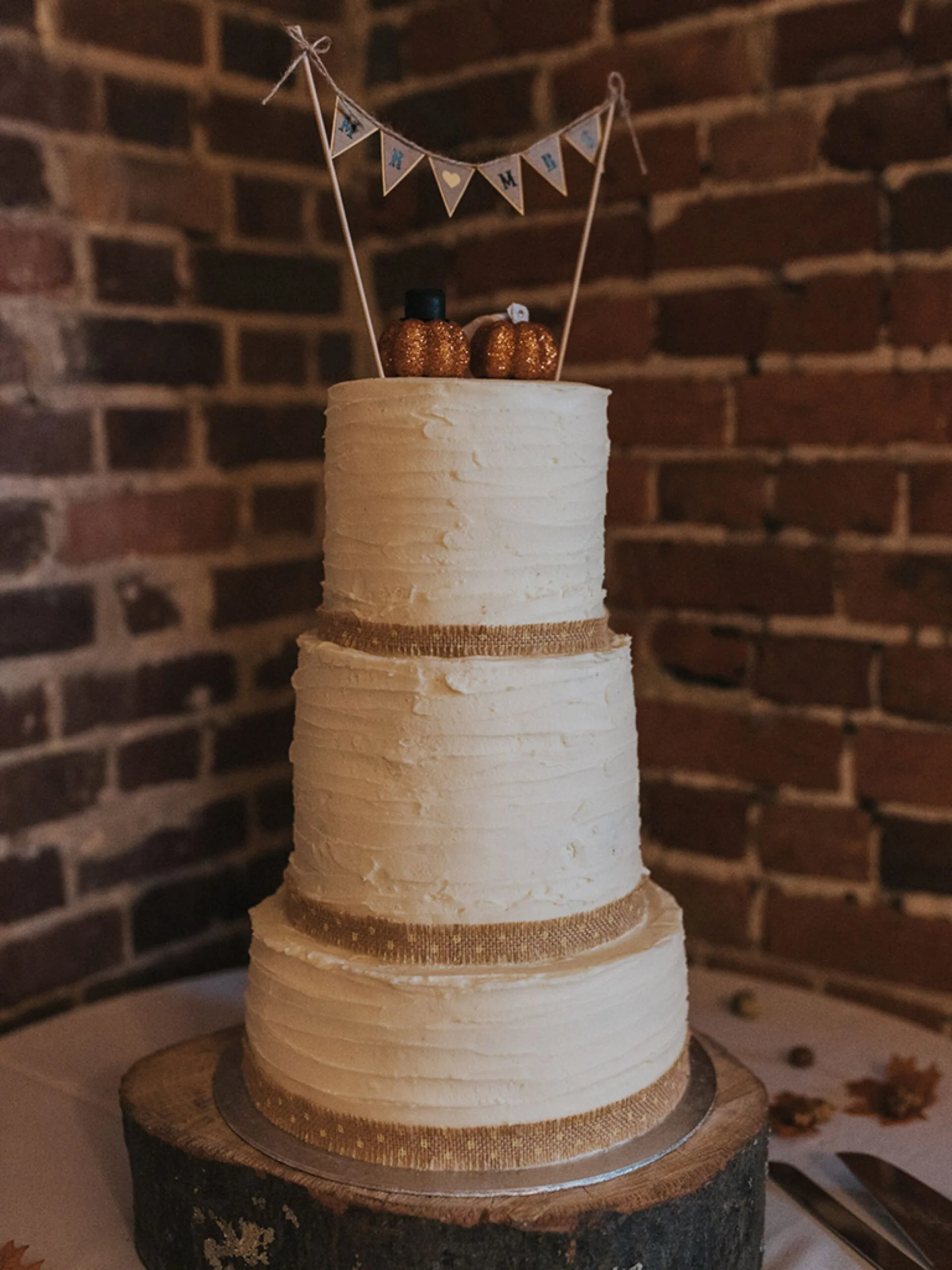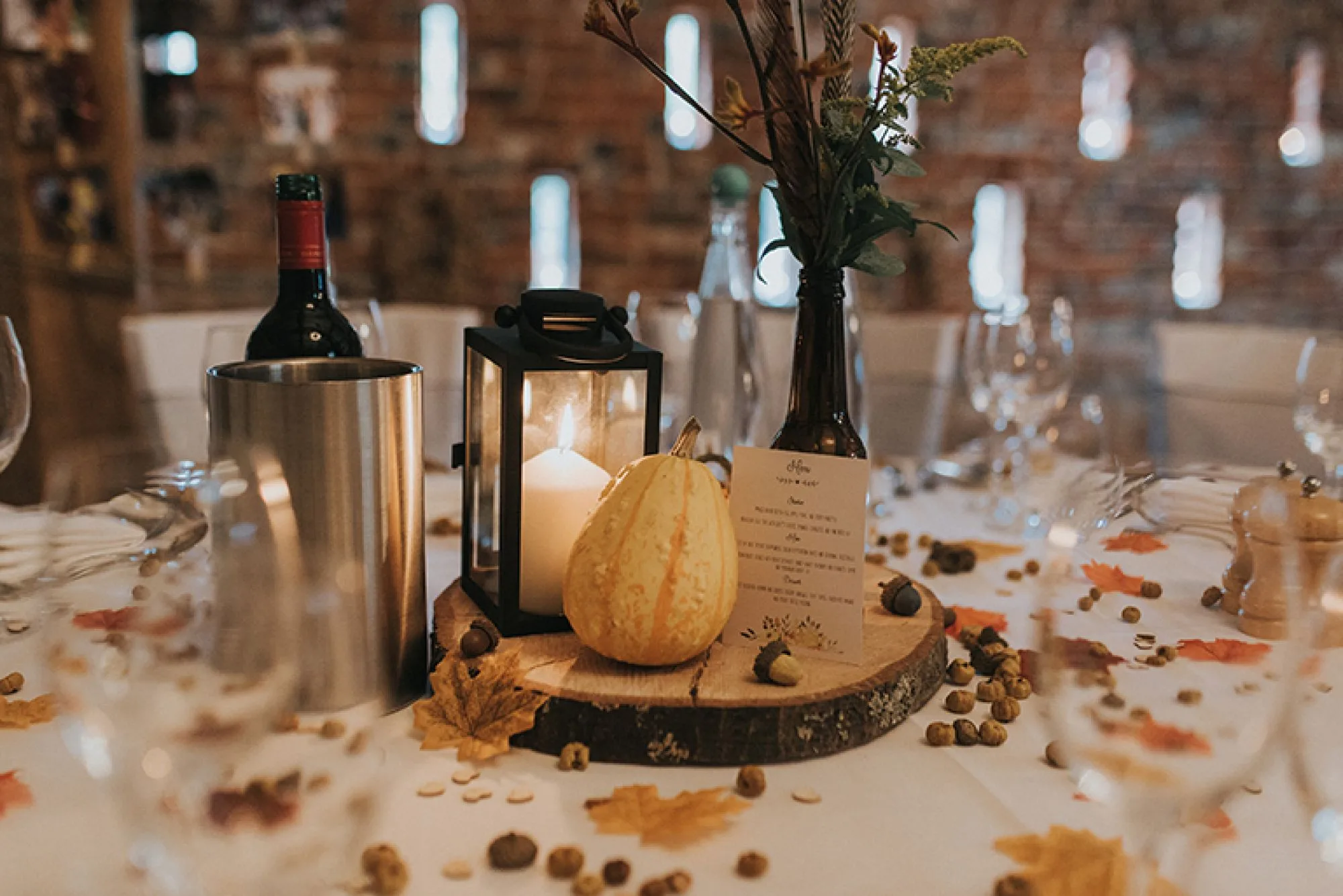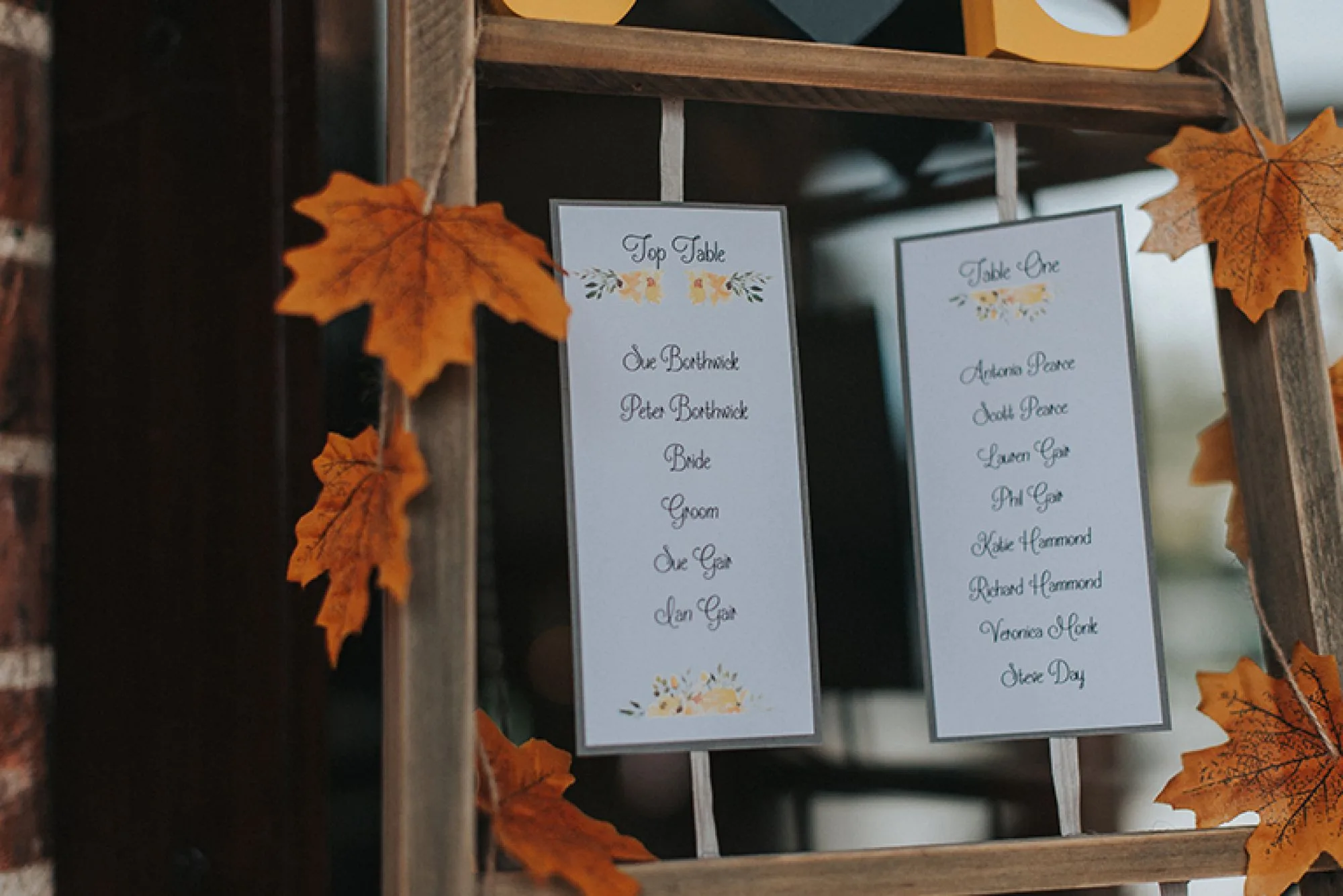“We had glittery pumpkin toppers for our cakes, a photo ladder transformed into a table plan and signage painted in our yellow theme. We also had a photo montage, home grown gourds scattered around the venue and beautiful red oak leaves in our centrepieces.” – Jenny
