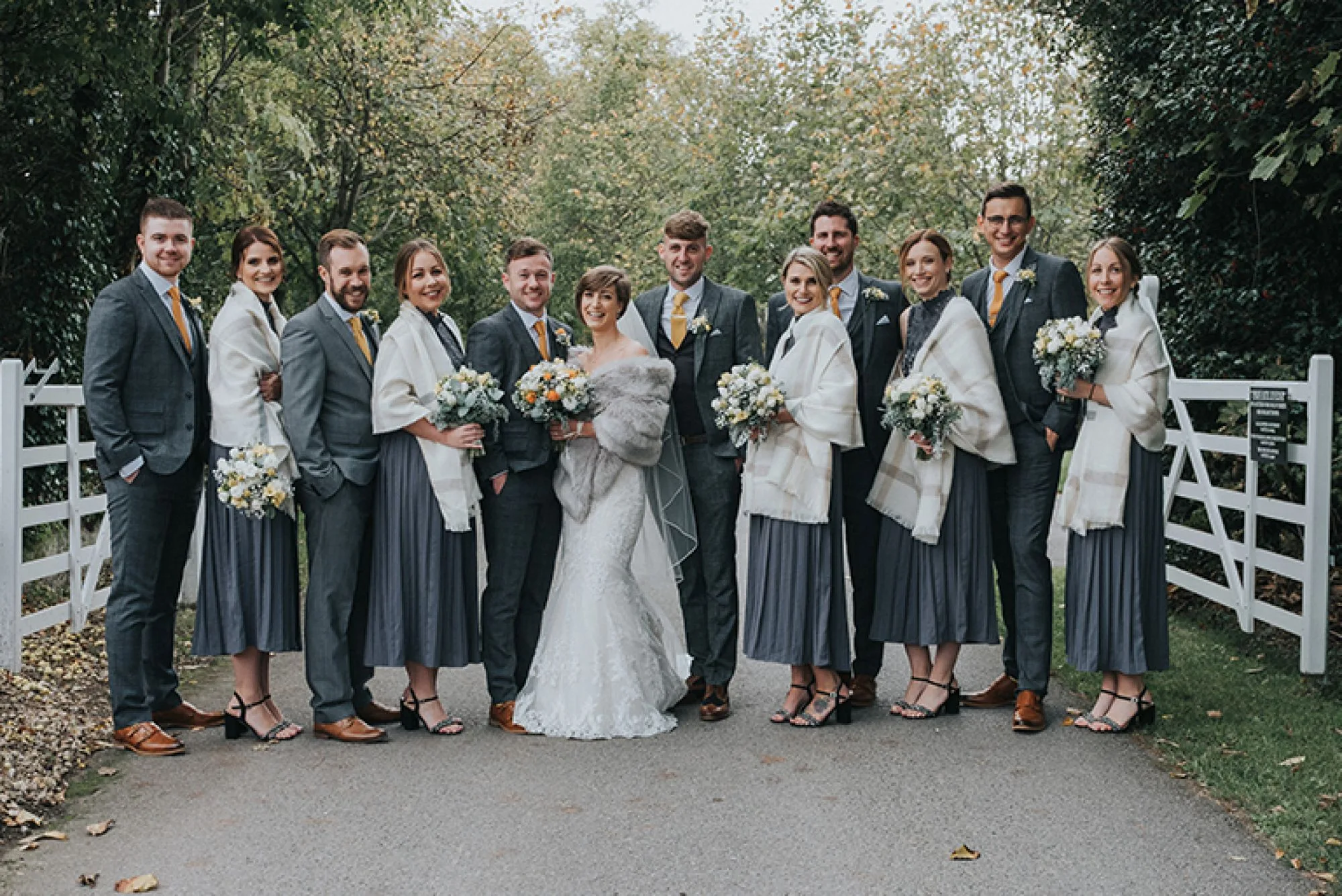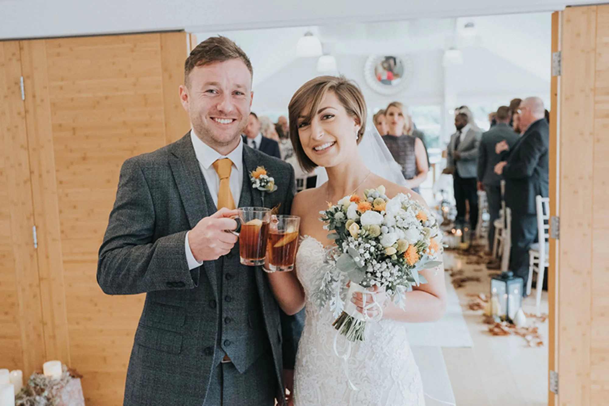 The happy couple chose an eye-catching colour scheme of greys and yellows, selecting yellow as it is Jenny’s favourite colour and the charcoal greys and burnt oranges to embrace an autumnal theme.