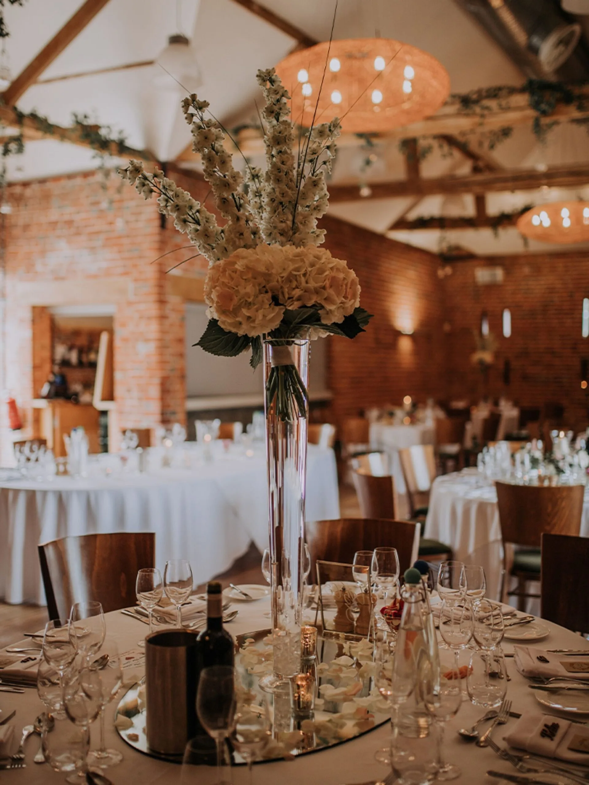 Exquisite seasonal flowers played a key role in the décor with hand-tied bouquets featuring white roses with pale pink astilbe and eucalyptus. Low centrepieces included pillar candles and silver pots with foliage and flowers while glass vases filled with white delphiniums, grasses and hydrangea created taller arrangements.