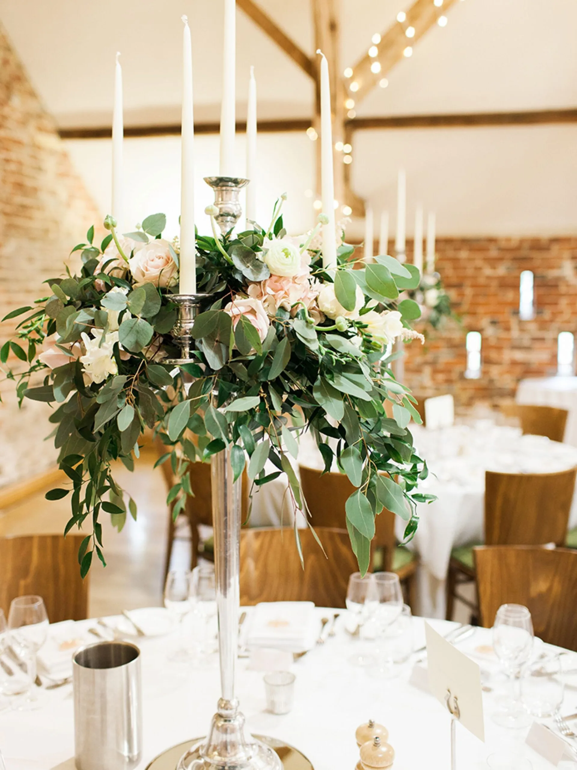Embracing tones of blush pink, ivory and metallics, Rachel and Stuart set the scene with beautiful decorations. Storm lanterns and pillar candles lined the aisle for the ceremony while large floral arrangements sat either side of the registrar’s table.