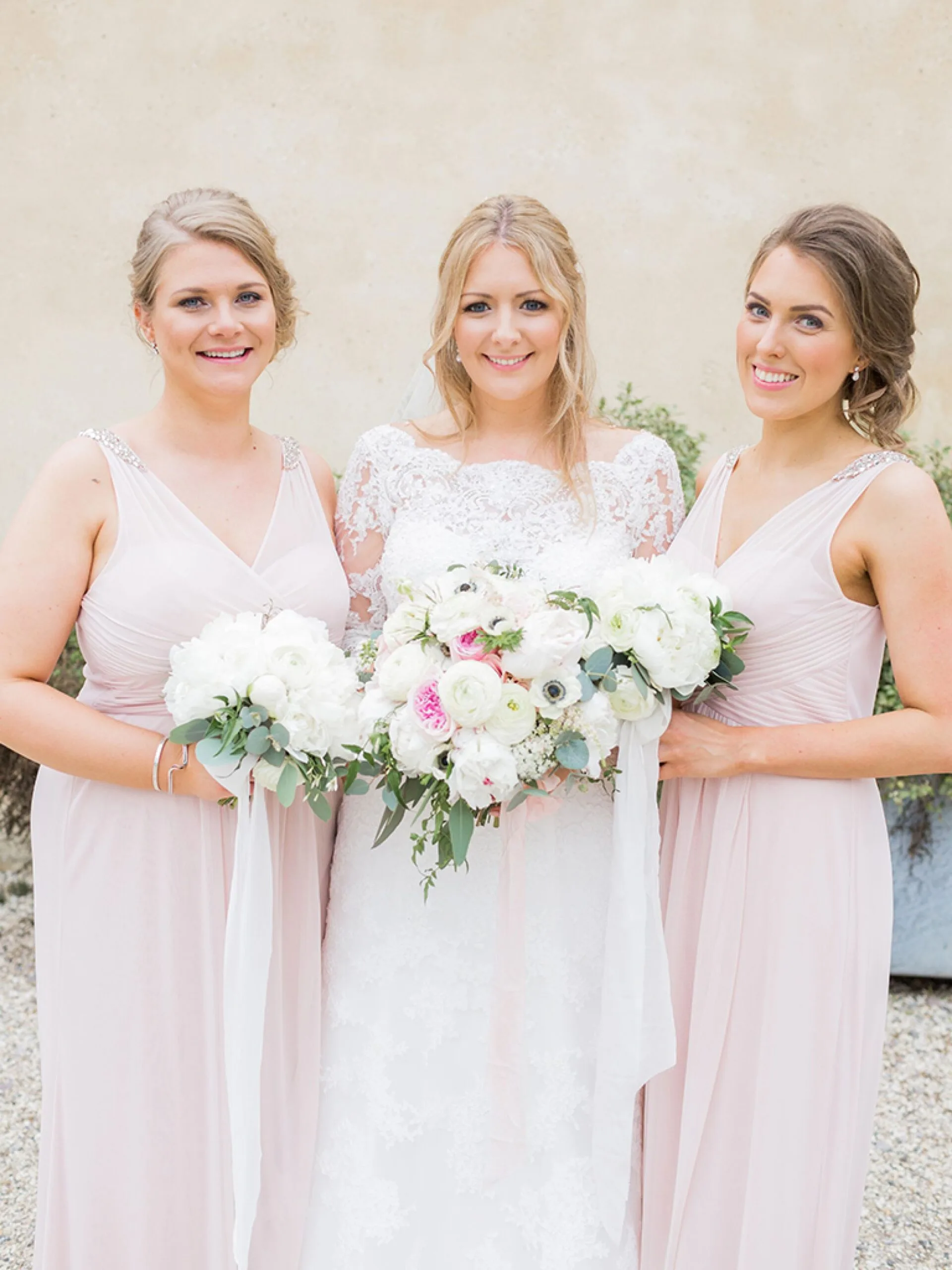 Finally, Rachel’s maid of honour and bridesmaid wore blush pink chiffon dresses with embellished shoulder straps by Adrianna Papell.