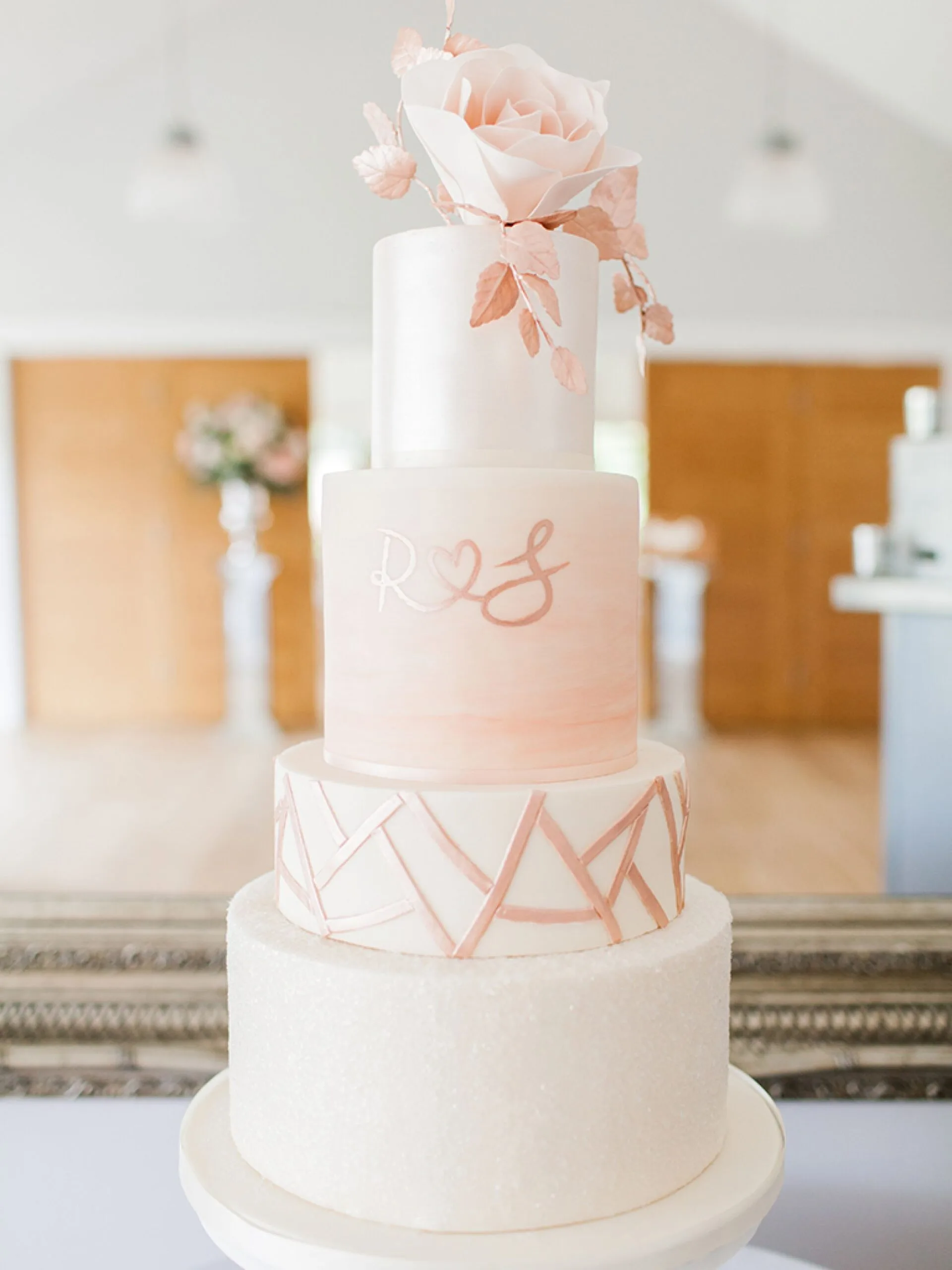 The spectacular cake was designed by Samantha at The Pretty Cake Company. Rachel chose rose gold and copper accents, an exquisite sugar flower, blush watercolour and their initials. With three different flavours including chocolate brownie with salted caramel buttercream, it certainly tasted as magnificent as it looked!