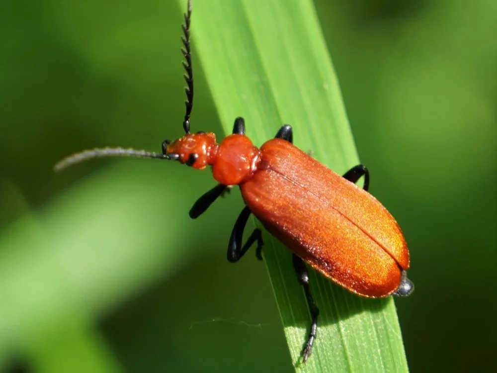 The beauty of insects is definitely in the eye of the beholder, and this next spring insect is both beautiful and strangely unpleasant. The red-headed cardinal beetle is another predator that appears around our lakes and rivers in spring, and although its life cycle is not directly associated with water, the adults spend an unusual amount of time near water often basking on waterside vegetation. It is often mistaken for the invasive alien red lily beetle, but the red lily beetle is a herbivore (eating garden lilies and fritillaries) while the cardinal beetle is a predator. The antennae of the cardinal beetle have deeply notched serrations, while the red lily beetle has mere indentations on its antennae. The red lily beetle has bright shiny blood red wing cases covered in tiny dimples, while the cardinal has a slightly less vibrant red/orange colour with no dimples on it’s wing cases.