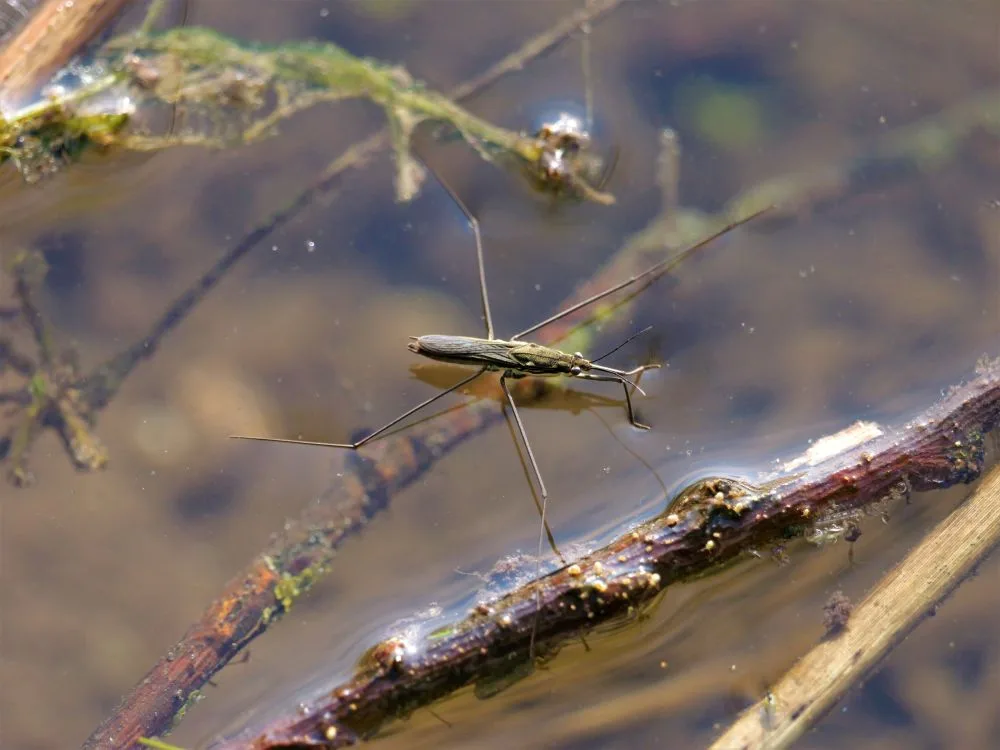 While damselflies and dragonflies spend their larval stage in the water and their adult stage in the air, another important insect that appears at this time of year remains on the water during it’s adult stage. The pond skater is a common insect on our lakes and being another predator represents another important part of the food chain, controlling populations of other insects both aquatic and terrestrial. The adult skater hibernates on dry land under leaf litter in our northern winters, and then appears as a surface-living insect in the spring. The eggs are laid underwater and the nymph goes through numerous stages of development before reaching maturity. Walk around the lakes and rivers in late summer and it is sometimes possible to see vast rafts of pond skaters living communally. Any unfortunate insect stuck in the water is soon set upon by many pond skaters.