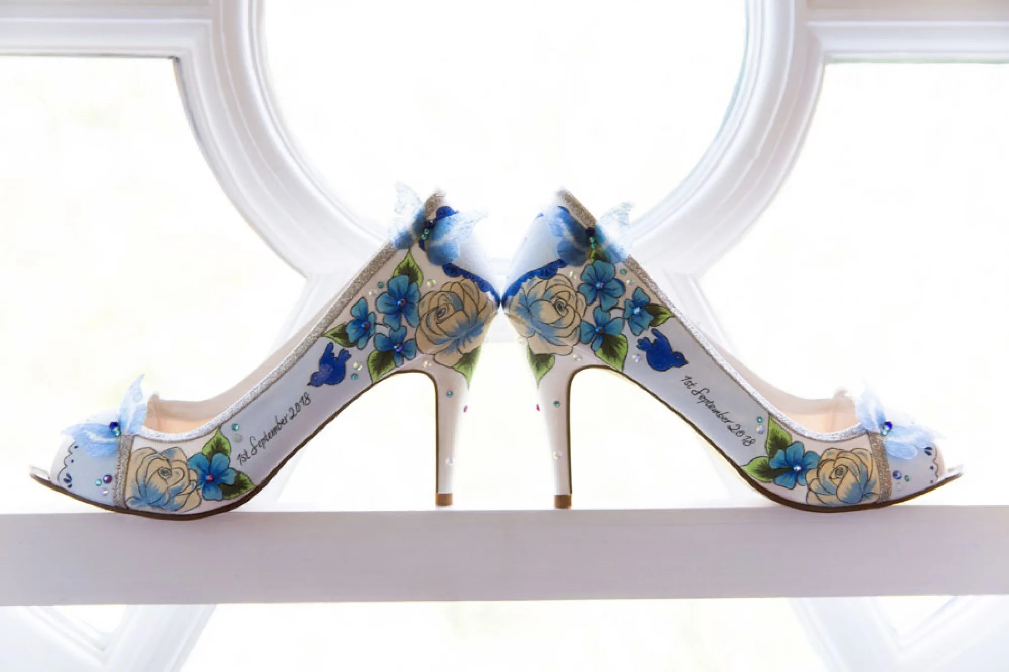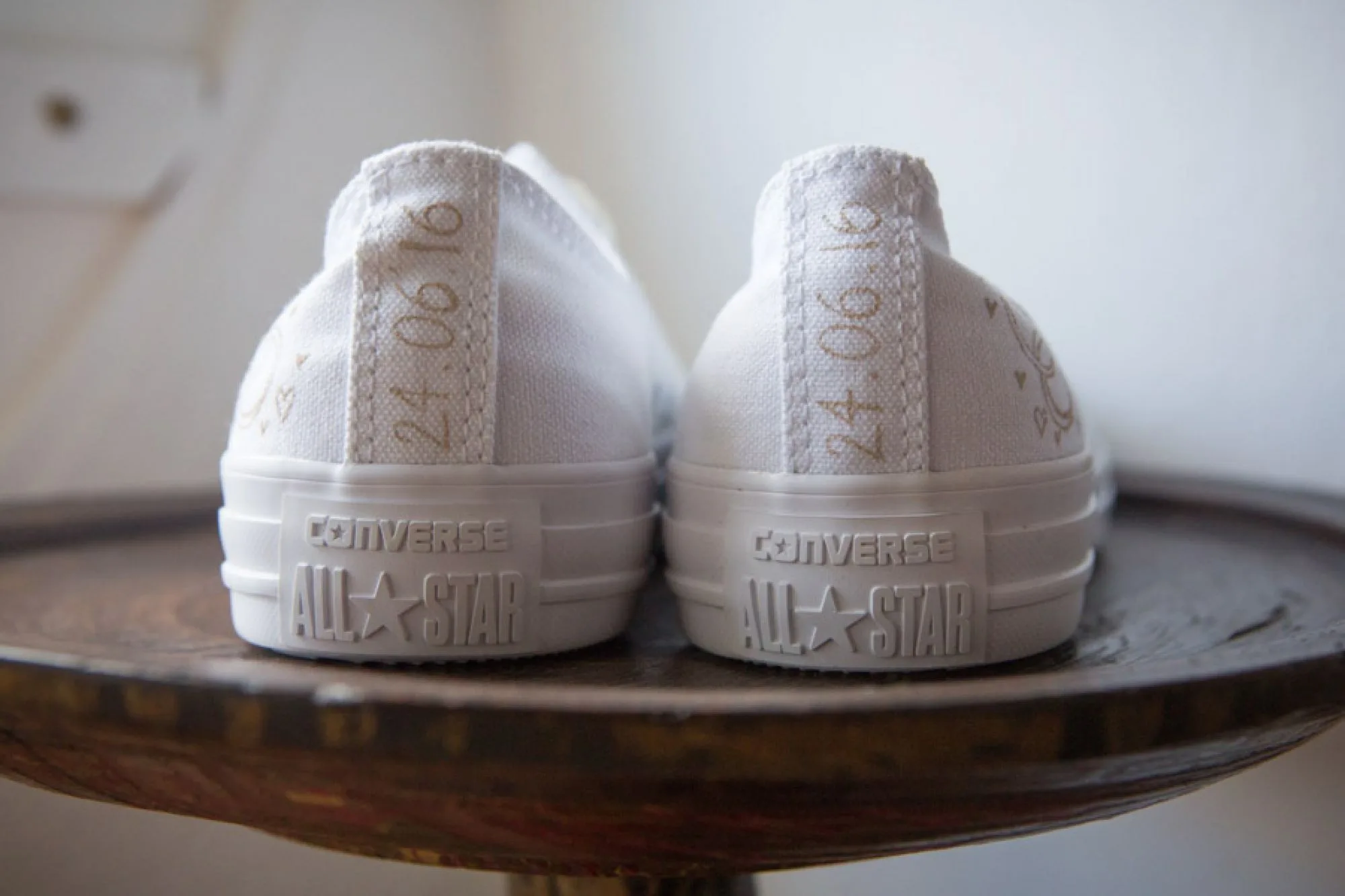 How about a personalised flat sandal or trainer? They are a great way to let your hair down in your evening reception, and you can wear them as a memory after your wedding is over. You could purchase some all white plimsolls and embellish them with your initials and ribbon laces? This doesn’t need to cost the earth, with options ranging from Primark to Converse. Alternatively opt for unique touches such as detailing on the soles of your shoes.