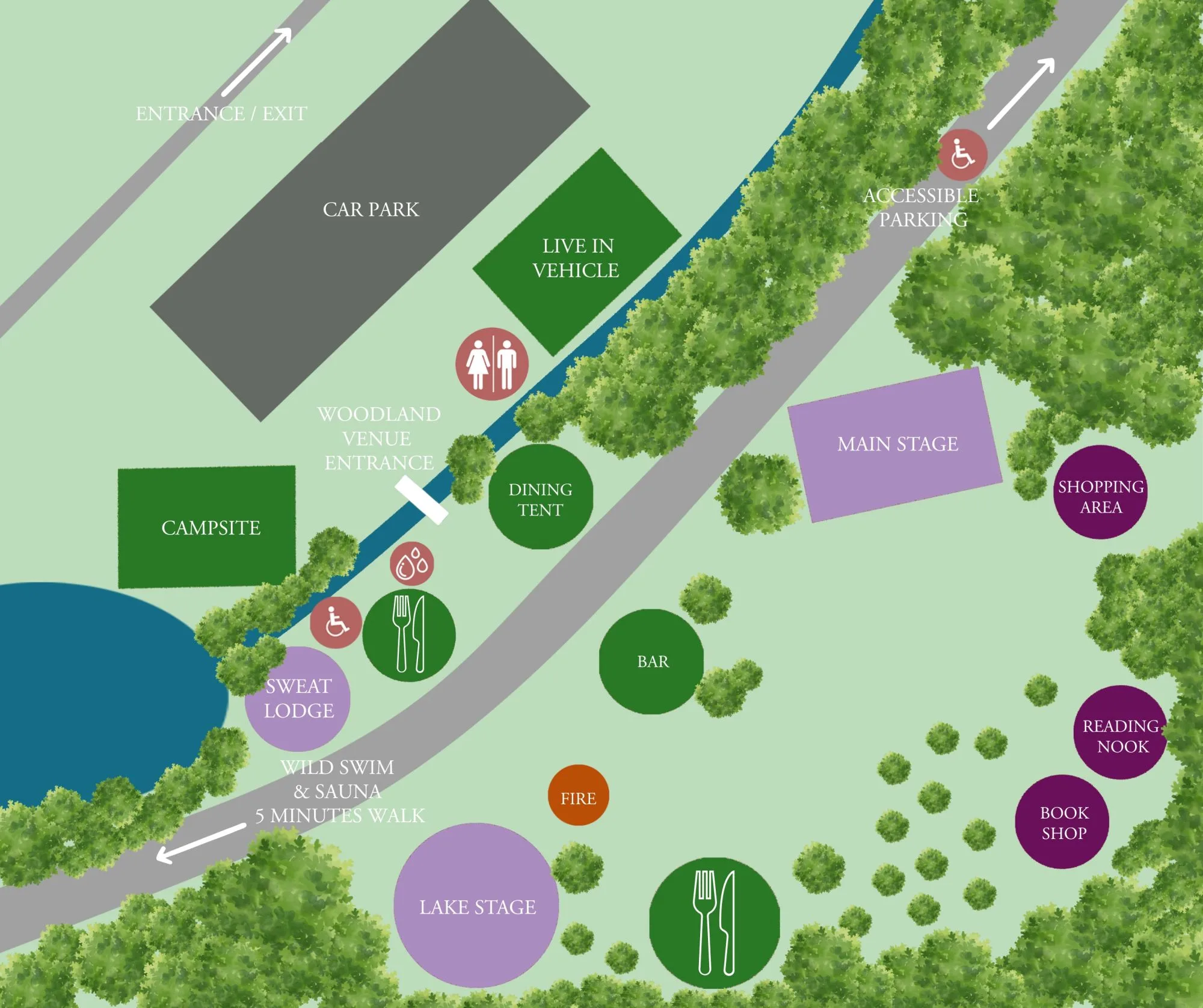 Well Read takes place in The Woodland venue at Wasing. There is undulating and uneven areas of grass, woodland & woodchip throughout the venue. The venue is as nature intended and there is therefore no hardstanding pathways or tracks.