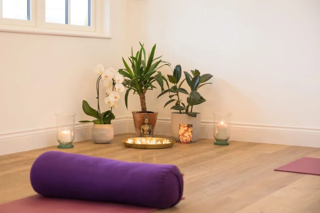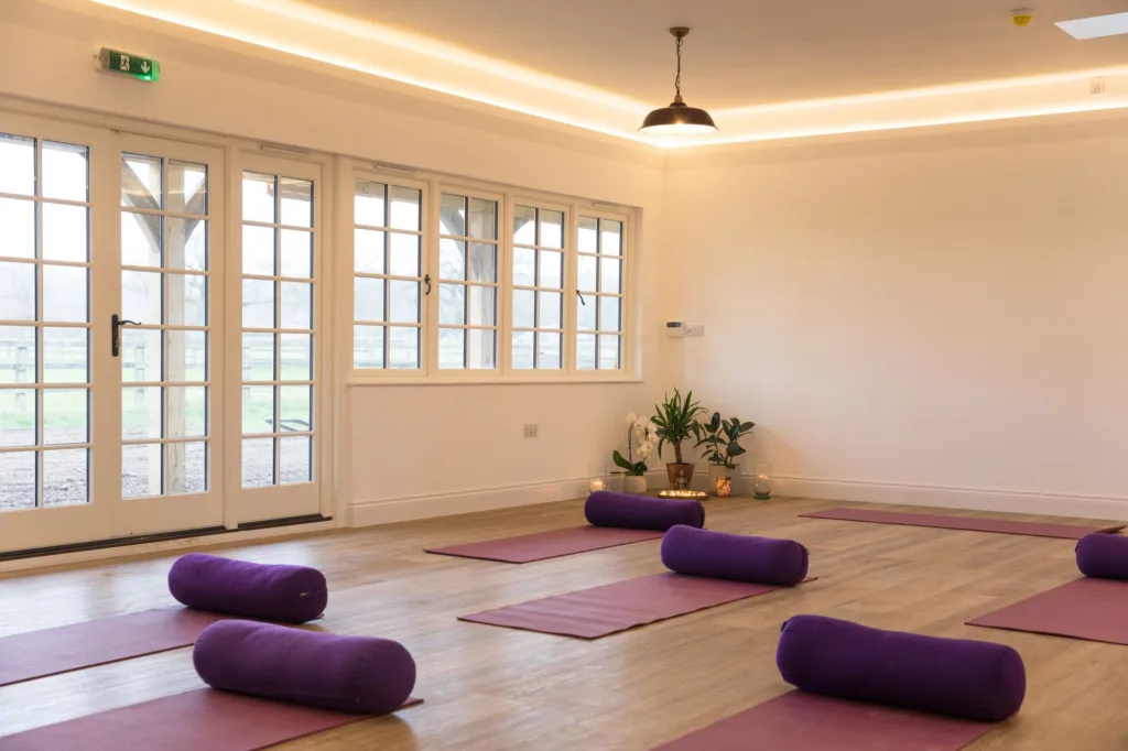 It has one large, bright room with underfloor heating and comes equipped with the yoga props for use. There are 3 bathrooms and a small, fully equipped kitchen.